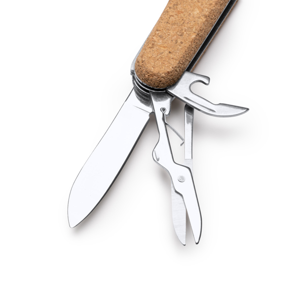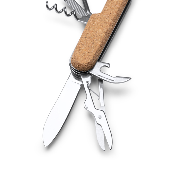 Διαφημιστικός Σουγιάς Πολυεργαλείο με σώμα και εξαρτήματα από ανοξείδωτο ατσάλι και λαβή από φελλό με εκτύπωση ή εκτύπωση laser των στοιχείων της επιχείρησής σας. Διαθέτει 9 διαφορετικά εργαλεία: μαχαίρι, ψαλίδι, κατσαβίδι, ανοιχτήρι, τιρμπουσόν κ.ά.. Τέλος, περιλαμβάνει λουράκι μεταφοράς από δερματίνη, επιτρέποντάς σας να το μεταφέρετε άνετα και εύκολα μαζί σας.