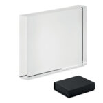 Διαφημιστικό Bραβείο σε ορθογώνιο σχήμα κατασκευασμένο από γυαλί και βάση από φυσικό ξύλο οξιάς με χάραξη laser των στοιχείων της επιχείρησής σας.