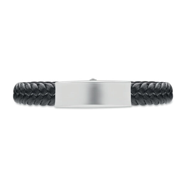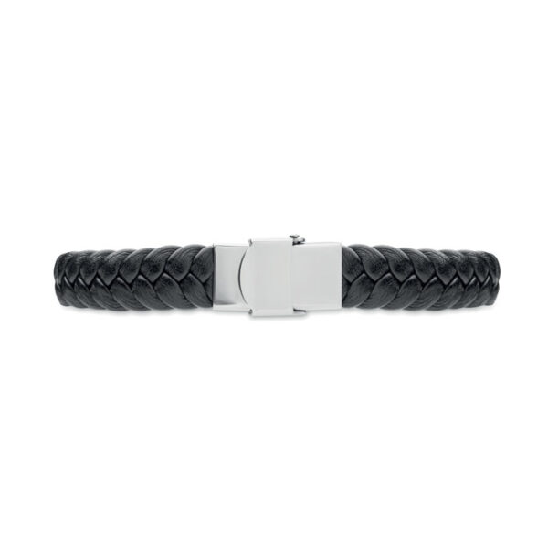 Διαφημιστικό Βραχιόλι καρπού, πλεκτό κατασκευασμένο από δερματίνη με γυαλιστερό κούμπωμα από ατσάλι και χάραξη laser ή εκτύπωση των στοιχείων της επιχείρησής σας. Κούμπωμα που κλείνει με ώθηση. Περιφέρεια καρπού: 21cm.