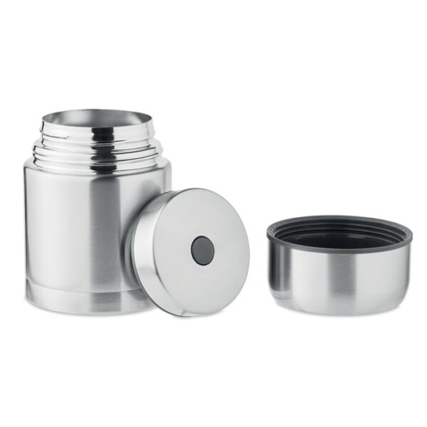 Διαφημιστικό Δοχείο Αποθήκευσης φαγητού διπλού τοιχώματος κατασκευασμένο από ανοξείδωτο ατσάλι με βιδωτό καπάκι και με εκτύπωση ή ψηφιακή εκτύπωση ή και χάραξη laser των στοιχείων της επιχείρησής σας. Ιδανικό για την μεταφορά και την αποθήκευση υγρών και στερεών τροφίμων. Χωρητικότητα: 800ml.