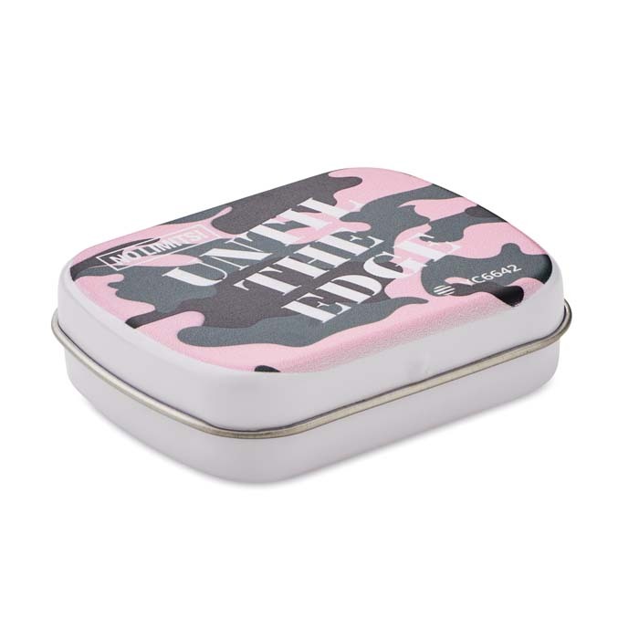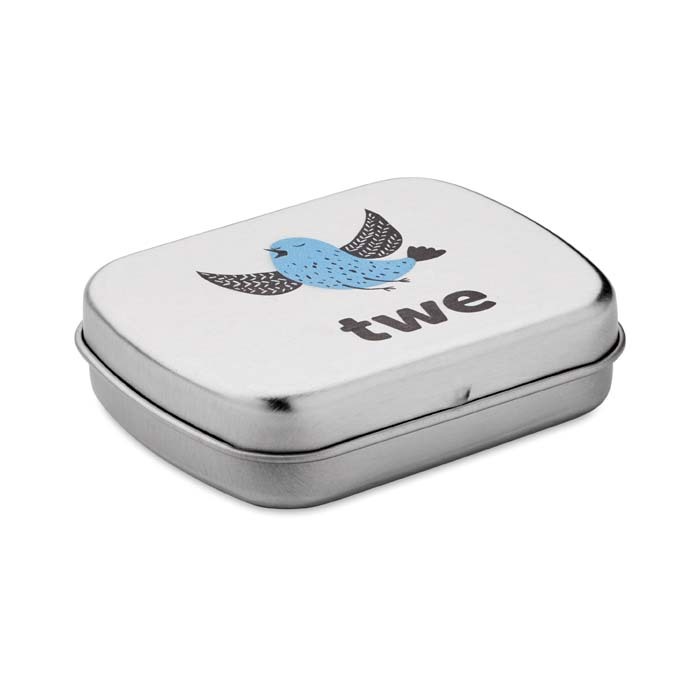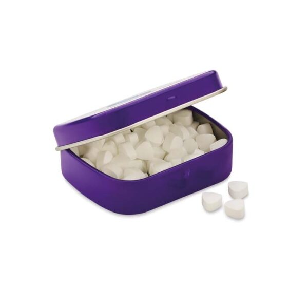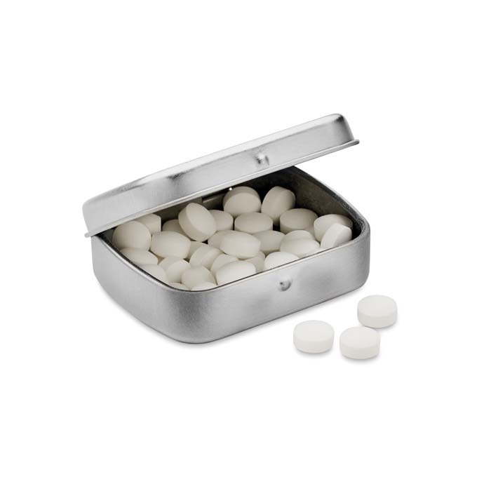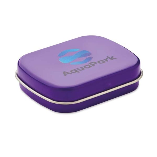 Διαφημιστικό Δοχείο Ζαχαρωτών επαναχρησιμοποιούμενο με μεντεσέ, κατασκευασμένο από αλουμίνιο με εκτύπωση του σχεδίου και των στοιχείων της επιχείρησής σας. Εύκολο άνοιγμα.
