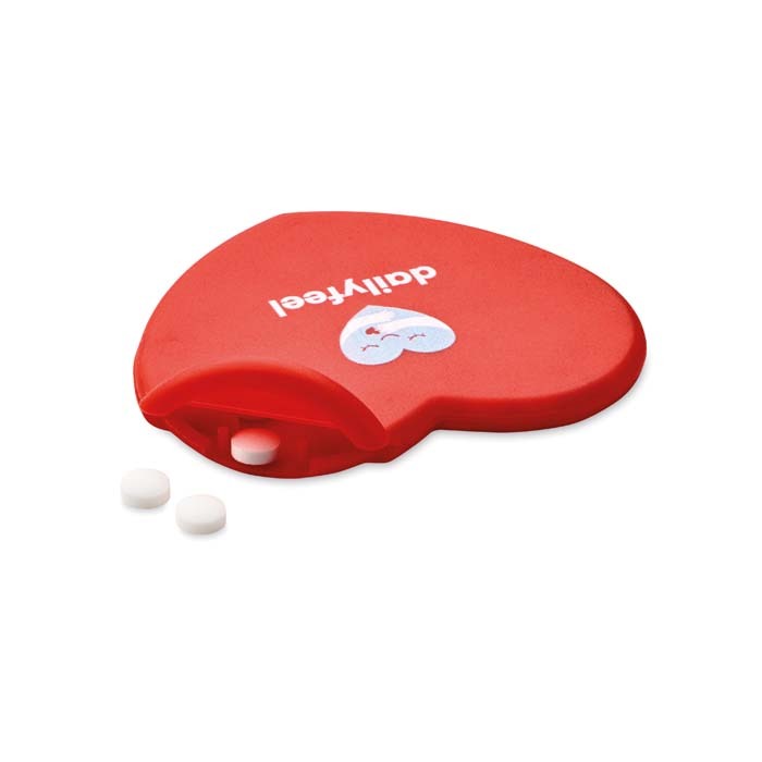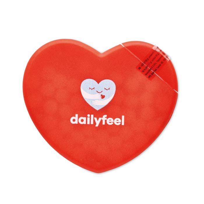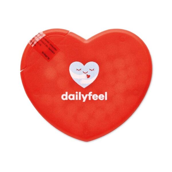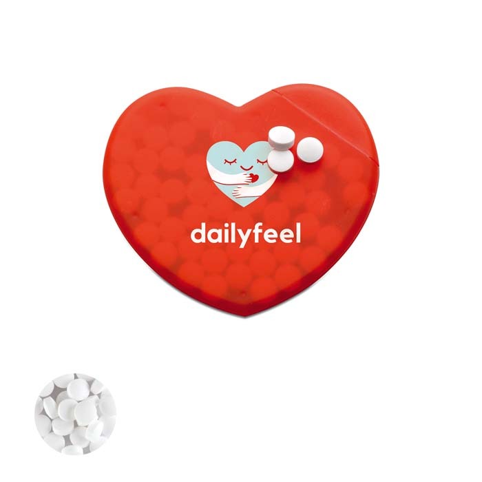 Διαφημιστικό Δοχείο Ζαχαρωτών από πλαστικό σε σχήμα καρδιάς με εκτύπωση του σχεδίου και των στοιχείων της επιχείρησής σας. Εύκολο άνοιγμα.