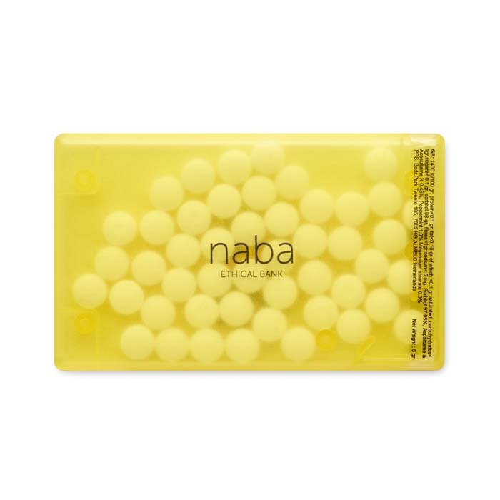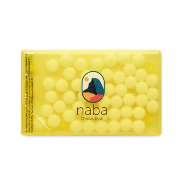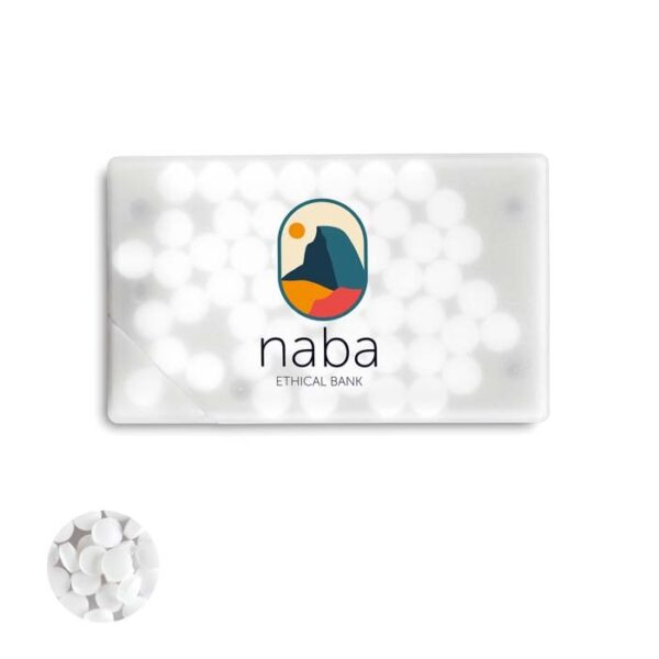 Διαφημιστικό Δοχείο Ζαχαρωτών από πλαστικό σε σχήμα πιστωτικής κάρτας με εκτύπωση του σχεδίου και των στοιχείων της επιχείρησής σας. Εύκολο άνοιγμα.