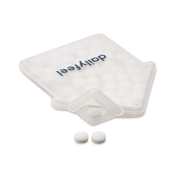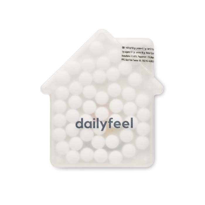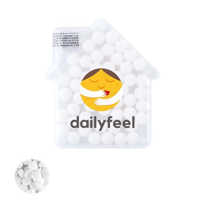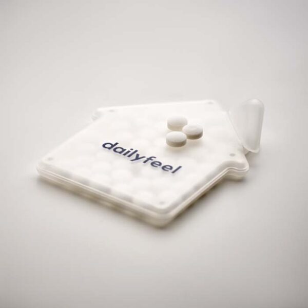 Διαφημιστικό Δοχείο Ζαχαρωτών από πλαστικό σε σχήμα σπιτιού με εκτύπωση του σχεδίου και των στοιχείων της επιχείρησής σας. Εύκολο άνοιγμα.