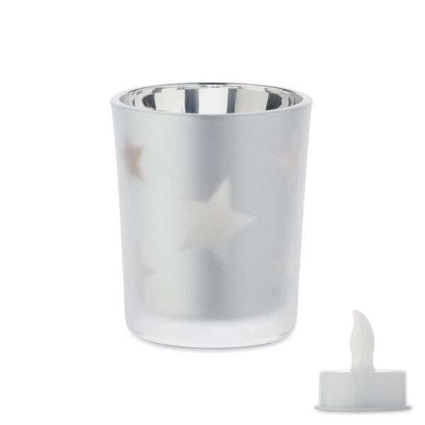 Διαφημιστικό Ηλεκτρικό Κερί LED αποσπώμενο, με γυάλινο δοχείο με φινίρισμα πάγου με χριστουγεννιάτικο σχέδιο αστεριών και εκτύπωση ή μεταξοτυπία ή και χάραξη laser των στοιχείων της επιχείρησής σας. Λειτουργεί με μία μπαταρία κουμπί cell CR2032 (περιλαμβάνεται).