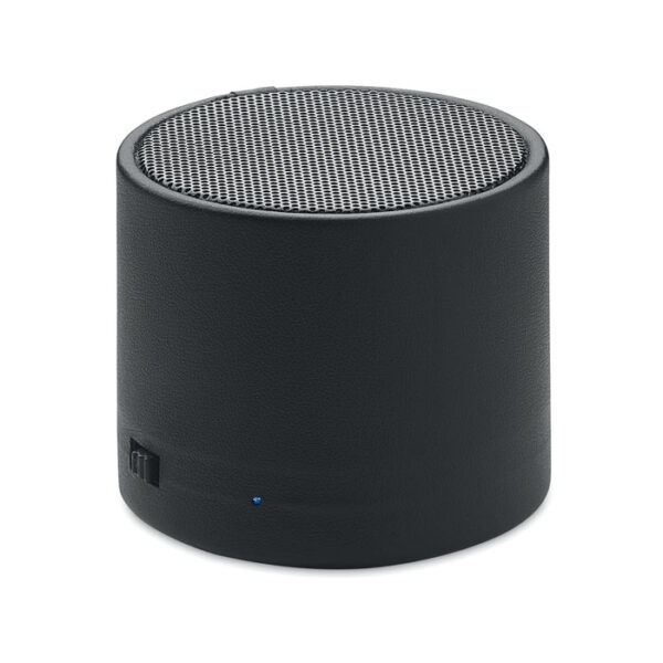 Διαφημιστικό Ηχείο Bluetooth 5.0 ασύρματο με σώμα κατασκευασμένο από 40% ανακυκλωμένο πλαστικό ABS και 18% ανακυκλωμένη δερματίνη PU με μεταξοτυπία ή εκτύπωση ή και χάραξη laser των στοιχείων της επιχείρησής σας. Διαθέτει επαναφορτιζόμενη μπαταρία και ένδειξη φωτισμού. Τάση εξόδου: 3W, 3 Ohm και 5V. Χρόνος λειτουργίας περίπου 3 ώρες.