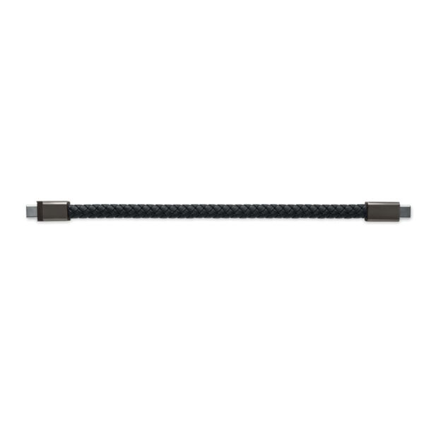 Διαφημιστικό Καλώδιο Φόρτισης και μεταφοράς δεδομένων 60W σε σχήμα βραχιολιού κατασκευασμένο σε πλέξη από δερματίνη PU και λεπτομέρειες από ψευδάργυρο με εκτύπωση ή ψηφιακή εκτύπωση ή και χάραξη laser των στοιχείων της επιχείρησής σας. Αποτελείται από 2 θύρες με απολήξεις από Τype-C σε Τype-C. Διάμετρος: 21cm.