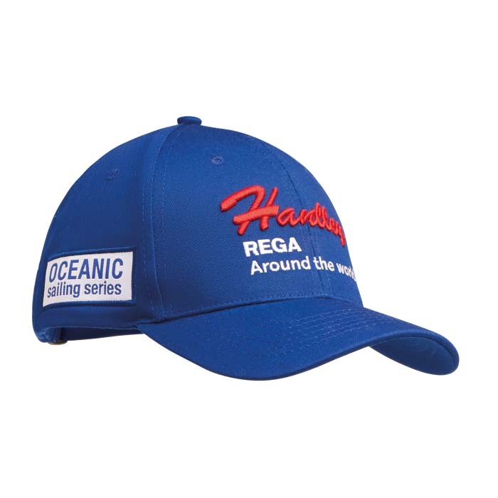 Διαφημιστικό Καπέλο 6φυλλο από βαμβάκι 260gsm με εκτύπωση του σχεδίου και των στοιχείων της επιχείρησής σας. Διαθέτει προ-καμπυλωτό γείσο με ραφές, κεντητές τρύπες εξαερισμού, ασορτί βαμβακερή ταινία εφίδρωσης και ρυθμιζόμενο λουράκι για να εξασφαλίζει εξατομικευμένη και άνετη εφαρμογή.