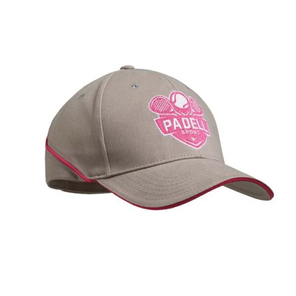 Διαφημιστικό Καπέλο 6φυλλο από βαμβάκι 280gsm με χρωματιστή λωρίδα στο πίσω μέρος και εκτύπωση του σχεδίου και των στοιχείων της επιχείρησής σας. Διαθέτει προ-καμπυλωτό γείσο διπλής στρώσης (sandwich) με ραφές, κεντητές τρύπες εξαερισμού, ασορτί βαμβακερή ταινία εφίδρωσης και ρυθμιζόμενο λουράκι για να εξασφαλίζει εξατομικευμένη και άνετη εφαρμογή.