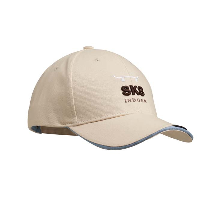 Διαφημιστικό Καπέλο 6φυλλο από βαμβάκι 280gsm με εκτύπωση του σχεδίου και των στοιχείων της επιχείρησής σας. Διαθέτει προ-καμπυλωτό γείσο διπλής στρώσης (sandwich) με ραφές, κεντητές τρύπες εξαερισμού, ασορτί βαμβακερή ταινία εφίδρωσης και ρυθμιζόμενο λουράκι για να εξασφαλίζει εξατομικευμένη και άνετη εφαρμογή.