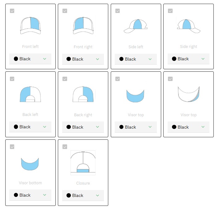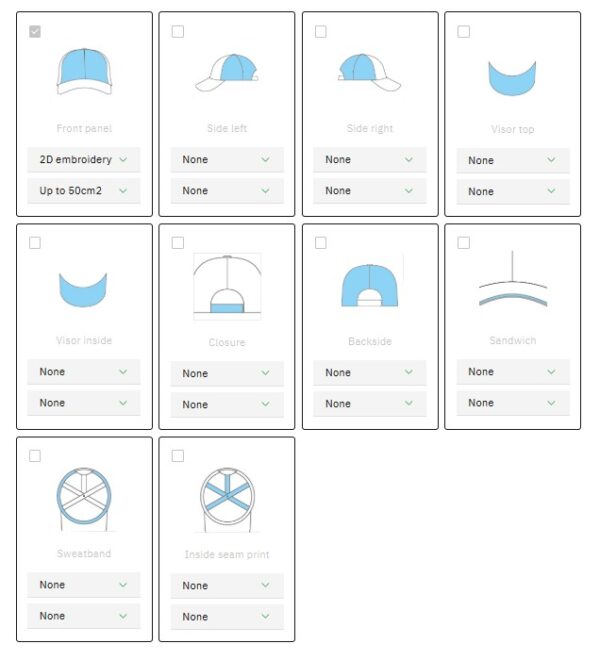 - Εκτύπωση λογοτύπου στο γείσο ή στο κούμπωμα ή στην ταινία εφίδρωσης ή μπροστά ή στα πλαϊνά ή πίσω ή και στο εσωτερικό του καπέλου.