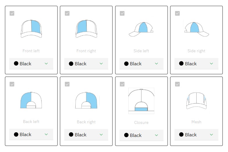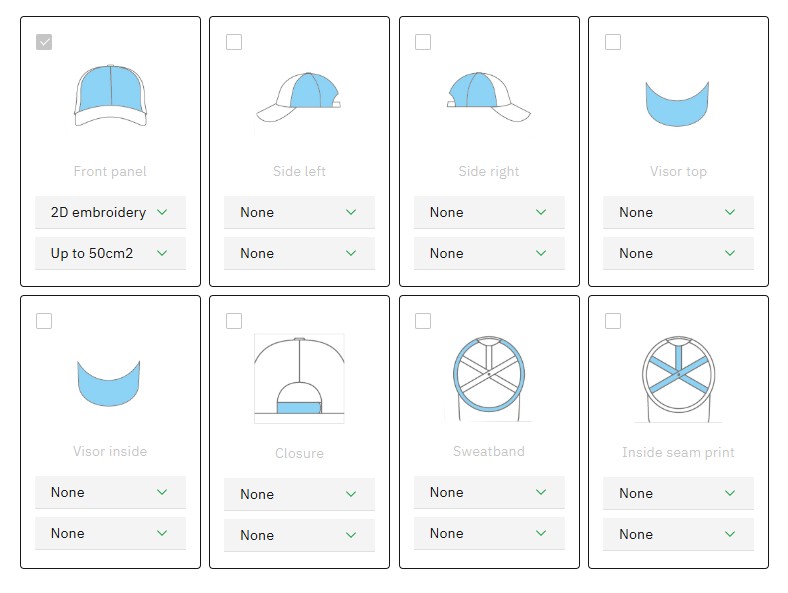 - Εκτύπωση λογοτύπου στο γείσο ή στο κούμπωμα ή στην ταινία εφίδρωσης ή μπροστά ή στα πλαϊνά ή πίσω ή και στο εσωτερικό του καπέλου.