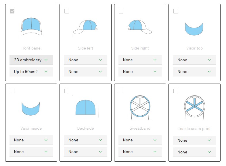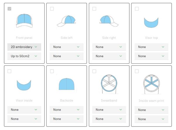 - Εκτύπωση λογοτύπου στο γείσο ή στην ταινία εφίδρωσης ή μπροστά ή στα πλαϊνά ή πίσω ή και στο εσωτερικό του καπέλου.