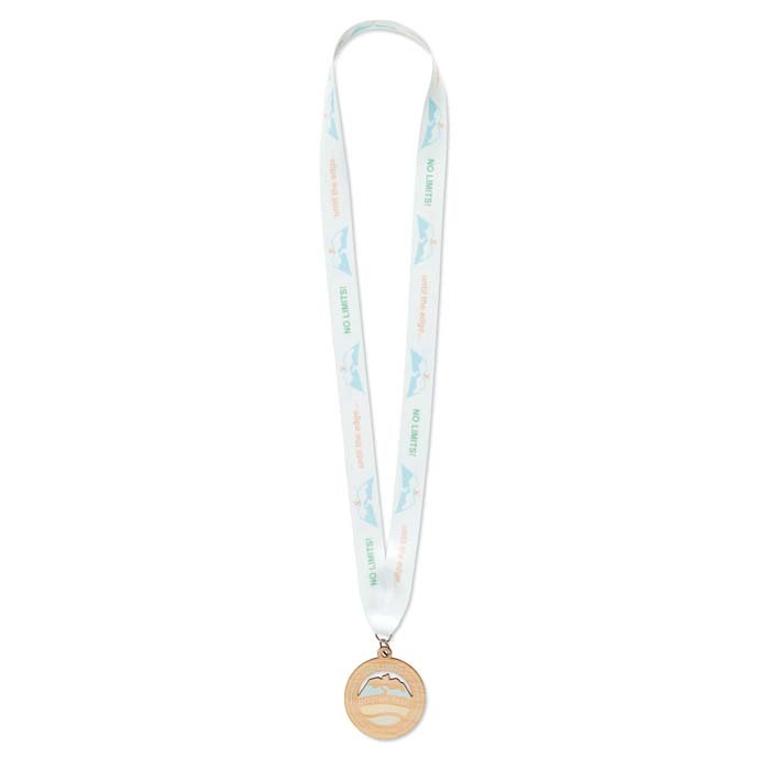 Διαφημιστικό Μετάλλιο σε διάφορα σχέδια κατασκευασμένο από ξύλο με κορδέλα από πολυεστέρα ή ανακυκλωμένο rPET με κρίκο στο τελείωμα και εκτύπωση του σχεδίου και των στοιχείων της επιχείρησής σας.