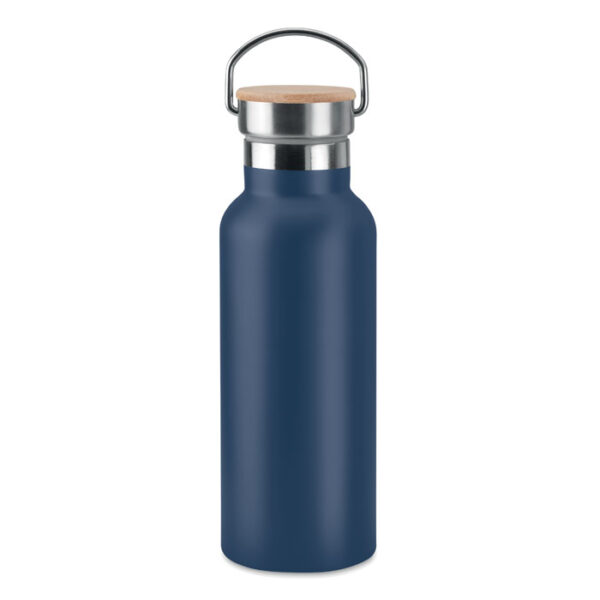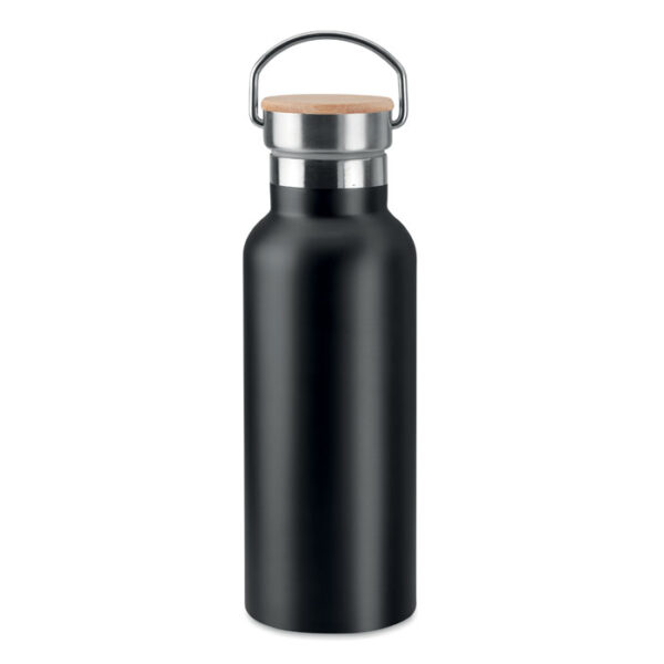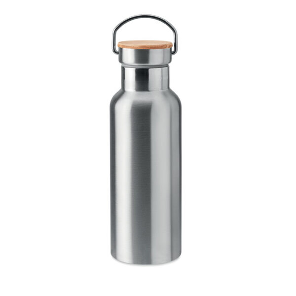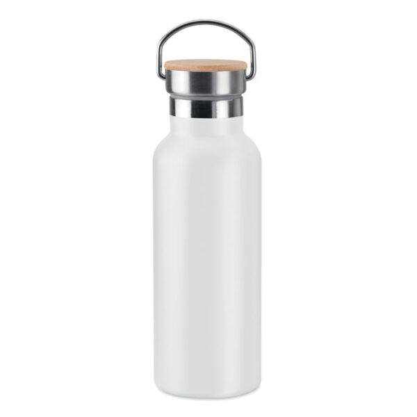 Διαφημιστικό Μπουκάλι από ανοξείδωτο ατσάλι ματ φινιρίσματος και καπάκι από μπαμπού με εκτύπωση ή ψηφιακή εκτύπωση ή χάραξη laser ή και εκτύπωση sublimation (μόνο στο λευκό χρώμα) σε διάφορα χρώματα και σχέδια των στοιχείων της επιχείρησής σας. Χωρητικότητα 500 ml. Με σχεδιασμό αποτροπής διαρροών και πτυσσόμενη μεταλλική λαβή.