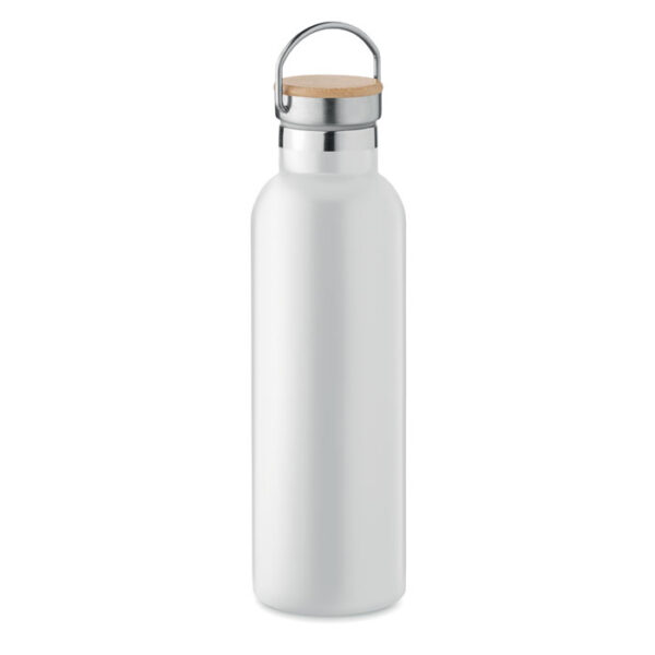 Διαφημιστικό Μπουκάλι διπλού τοιχώματος από ανοξείδωτο ατσάλι με ματ φινίρισμα, καπάκι με λεπτομέρειες από μπαμπού και λαβή μεταφοράς με εκτύπωση ή ψηφιακή εκτύπωση ή και χάραξη laser των στοιχείων της επιχείρησής σας. Παρέχει την δυνατότητα να μεταφέρετε και να διατηρείτε ζεστά ή κρύα τα ροφήματα σας μέσα στην ημέρα. Με σχεδιασμό αποτροπής διαρροών. Χωρητικότητα: 750ml.