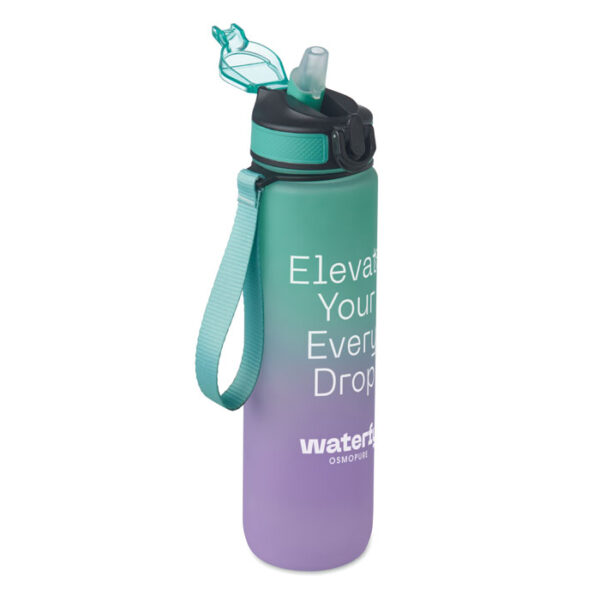 Διαφημιστικό Μπουκάλι αθλημάτων μονού τοιχώματος από πλαστικό PRET με εκτύπωση ή ψηφιακή εκτύπωση των στοιχείων της επιχείρησής σας. Διαθέτει βιδωτό καπάκι με ενσωματωμένο καλαμάκι και στόμιο σιλικόνης με κλείσιμο ασφαλείας, μετρητή στάθμης και ώρες πόσης στο εξωτερικό τοίχωμα, καθώς και ιμάντα μεταφοράς καρπού. Χωρητικότητα: 1L.