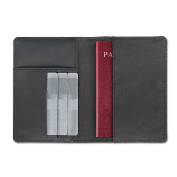 Διαφημιστική Θήκη Διαβατηρίου και καρτών κατασκευασμένο από διπλή στρώση πολυεστέρα RPET με προστασία RFID και εκτύπωση ή θερμομεταφορά ή και ψηφιακή θερμομεταφορά των στοιχείων της επιχείρησής σας. Διαθέτει 3 εσωτερικές θήκες καρτών, μία εγγράφων και μία διαβατηρίου.