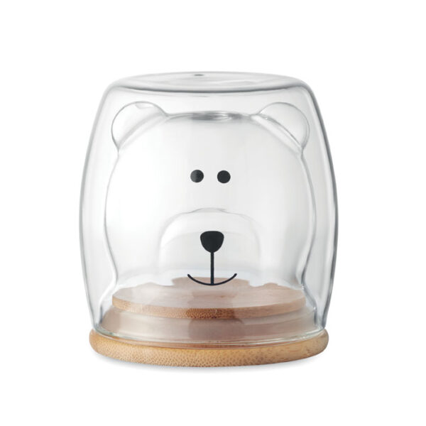 Διαφημιστική Ποτήρι διπλού τοιχώματος από βοριοπυριτικό γυαλί υψηλής ποιότητας με εσωτερικό σχέδιο σε σχήμα αρκουδάκι και προστατευτικό καπάκι από μπαμπού με εκτύπωση ή χάραξη laser των στοιχείων της επιχείρησής σας. Χωρητικότητα: 260ml.