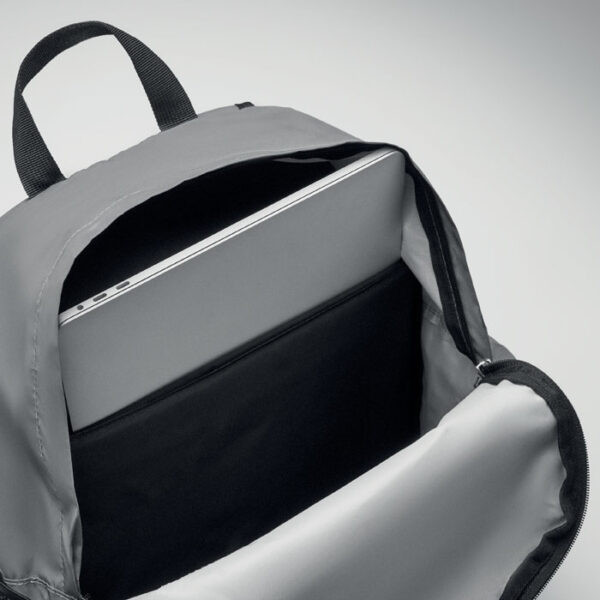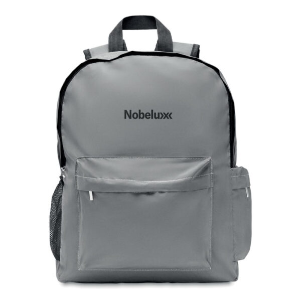 Διαφημιστικό Σακίδιο από πολυεστέρα υψηλής ανάκλασης 190Τ με εκτύπωση των στοιχείων της επιχείρησής σας. Διαθέτει κύρια θήκη με θέση για laptop 15 ιντσών, μία μπροστινή τσέπη με φερμουάρ, δύο πλαϊνές τσέπες η μία με κλείσιμο φερμουάρ και η άλλη με πολυεστέρα ripstop για να τοποθετείτε το μπουκάλι ή την ομπρέλα σας. Ρυθμιζόμενοι ιμάντες μεταφοράς. Πλάτη με επένδυση από ανακυκλωμένο πολυεστέρα PRET 600D.