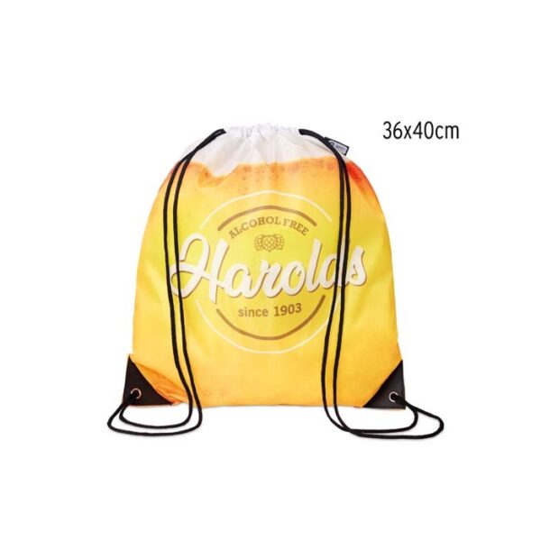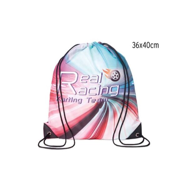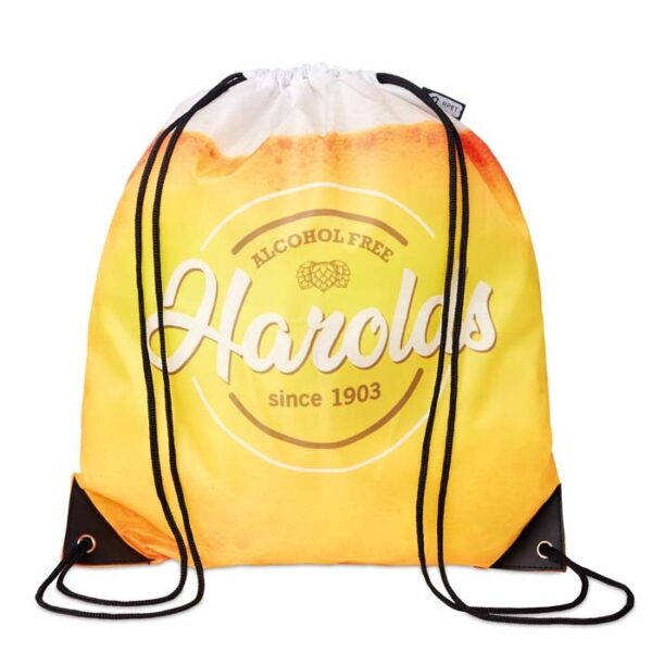 Διαφημιστικό Σακίδιο με κορδόνια, κατασκευασμένο από ανακυκλωμένο πολυεστέρα 210D και λεπτομέρειες από δερματίνη PU με εκτύπωση του σχεδίου και των στοιχείων της επιχείρησής σας. Βγαίνει σε 2 μεγέθη.