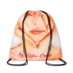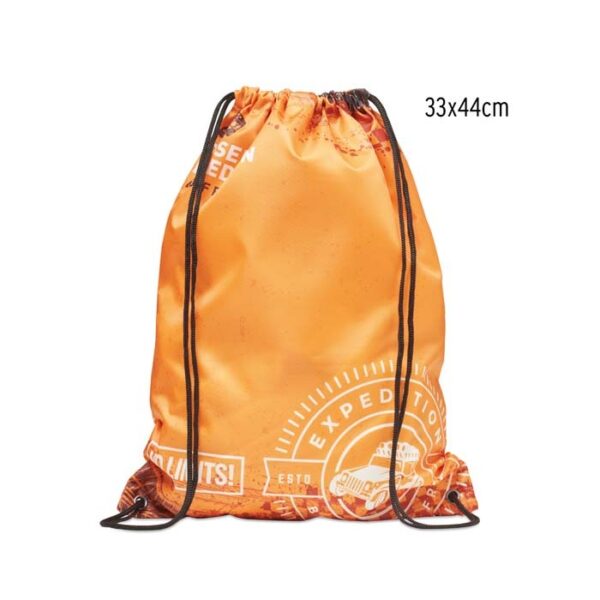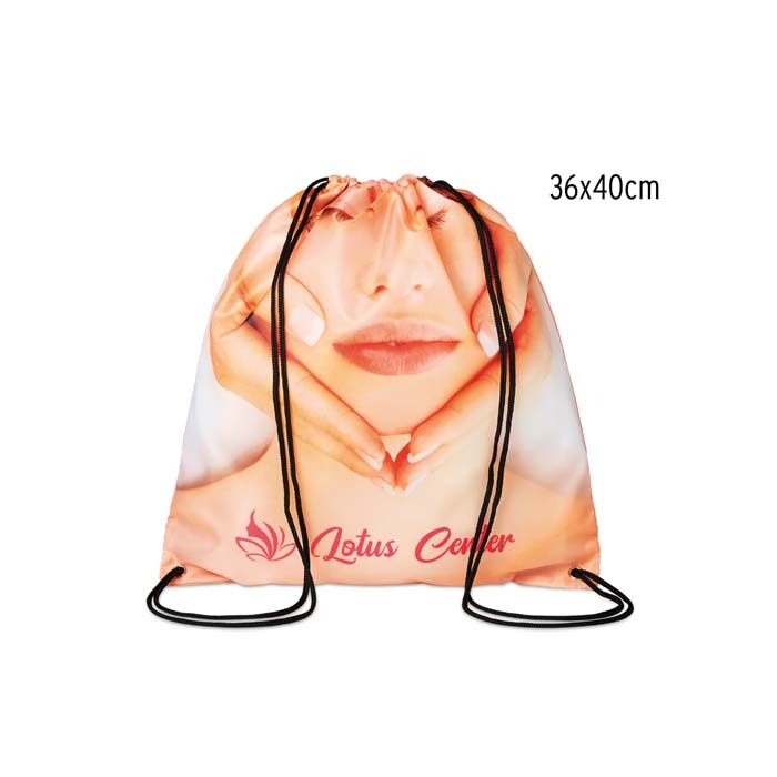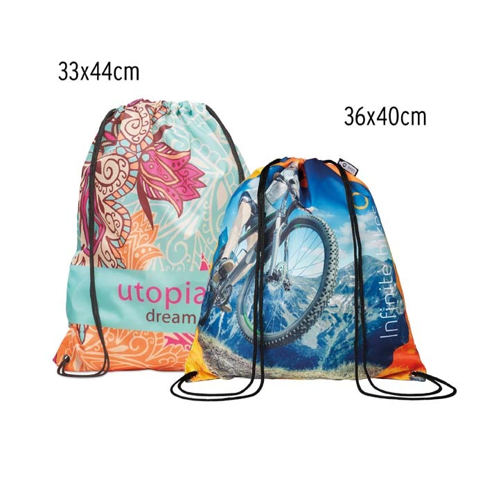 Διαφημιστικό Σακίδιο με κορδόνια, κατασκευασμένο από ανακυκλωμένο πολυεστέρα PRET με εκτύπωση του σχεδίου και των στοιχείων της επιχείρησής σας. Βγαίνει σε 2 μεγέθη.
