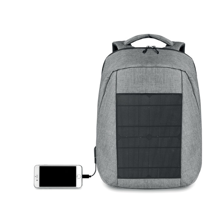 Διαφημιστικό Σακίδιο από διπλής στρώσης πολυεστέρα 600D PRET με θερμομεταφορά ή ψηφιακή θερμομεταφορά των στοιχείων της επιχείρησής σας. Διαθέτει 2 τμήματα, μία κύρια ευρύχωρη θήκη με θέση για laptop 13 ιντσών και μία για tablet με αρκετές εσωτερικές τσέπες αποθήκευσης. Περιλαμβάνει ακόμα πάνελ ηλιακής ενέργειας 10W με υποδοχή και καλώδιο USB, ενώ ο χρόνος φόρτισης του τηλεφώνου σε άμεση έκθεση στον ήλιο είναι περίπου 5-6 ώρες. Πλάτη και ιμάντες μεταφοράς με επένδυση.