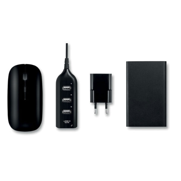 Διαφημιστικό Σετ Αξεσουάρ Υπολογιστή συσκευασμένα σε θήκη από πολυεστέρα EVA και δερματίνη PU με εκτύπωση ή μεταξοτυπία ή και θερμομεταφορά των στοιχείων της επιχείρησής σας. Περιλαμβάνει ένα ασύρματο ποντίκι, ένα διανομέα 4 θυρών USB 2.0, έναν αντάπτορα EU και ένα power bank 4000mAh, καθώς και καλώδιο φόρτισης micro USB.