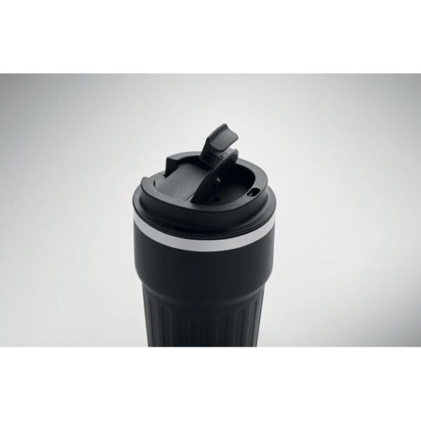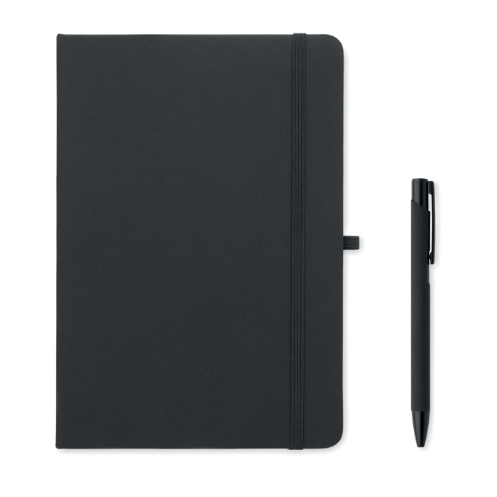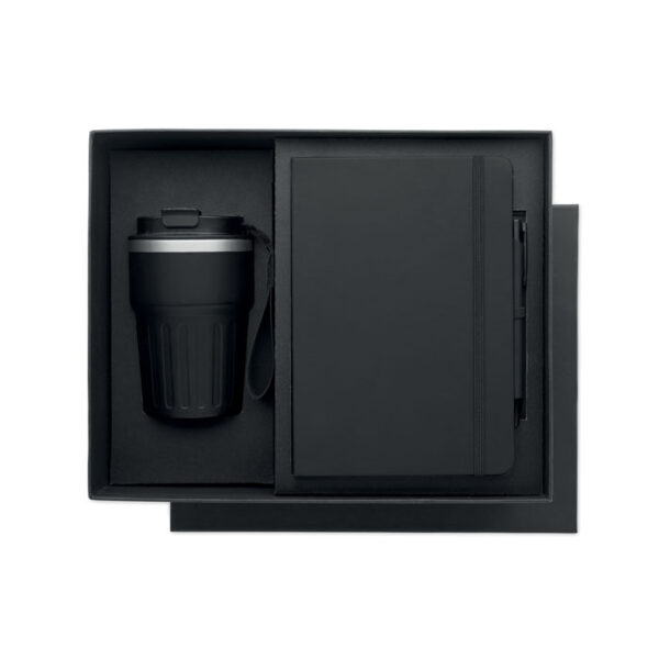Διαφημιστικό Σετ Γραφείου 3 τεμαχίων με εκτύπωση ή ψηφιακή εκτύπωση ή μεταξοτυπία ή και χάραξη laser των στοιχείων της επιχείρησής σας. Περιλαμβάνει σημειωματάριο Α5 με λάστιχο κλεισίματος και στυλοθήκη, στυλό με σώμα από ανακυκλωμένο αλουμίνιο και κούπα διπλού τοιχώματος από ανακυκλωμένο ανοξείδωτο ατσάλι με καπάκι από πολυεστέρα ΡΡ 350ml.