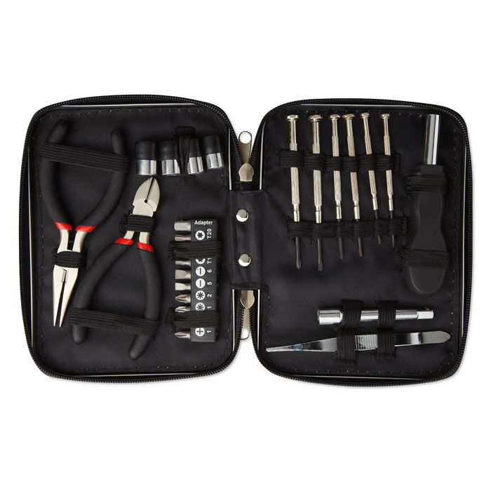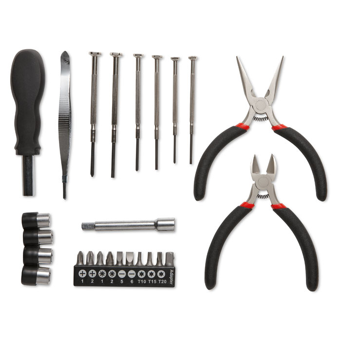 Διαφημιστικό Σετ Εργαλείων συσκευασμένo σε θήκη από αλουμίνιο με εκτύπωση ή ψηφιακή εκτύπωση ή και χάραξη laser των στοιχείων της επιχείρησής σας. Περιλαμβάνει έναν κόφτη, ένα μυτοτσίμπιδο, μία λαβή, 10 εναλλασσόμενες μύτες κατσαβιδιού, 4 καρυδάκια, 6 κατσαβίδια ακριβείας, ένα κουμπωτό κατσαβίδι και μία τσιμπίδα.