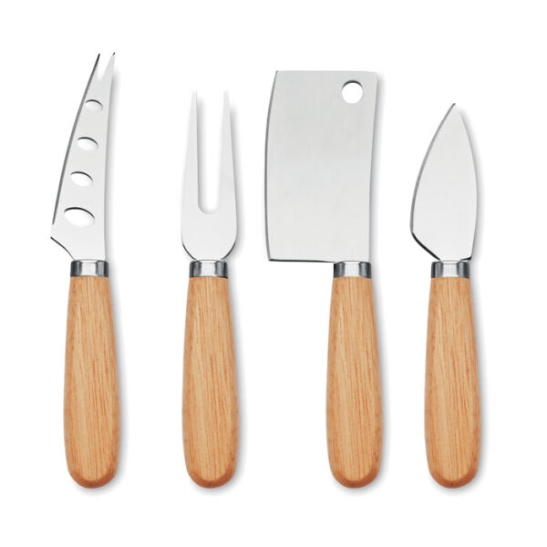 Διαφημιστικό Σετ Tυριού με 4 σκεύη από ανοξείδωτο ατσάλι και ξύλινη λαβή με λαστιχωτή υφή και εκτύπωση ή μεταξοτυπία ή και χάραξη laser των στοιχείων της επιχείρησής σας. Περιλαμβάνει δύο μαχαίρια τυριού, μπαλταδάκι και πηρούνα.