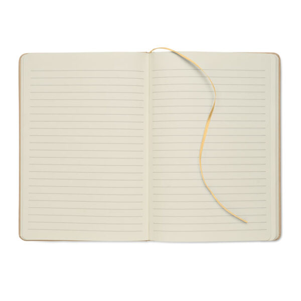 Διαφημιστικό Σημειωματάριο Α5 με σκληρά εξώφυλλα από ανακυκλωμένο χαρτόνι μπεζ χρώματος και επιμέρους χρωματιστές λεπτομέρειες με εκτύπωση ή ψηφιακή εκτύπωση ή και χάραξη laser των στοιχείων της επιχείρησής σας. Διαθέτει 160 σελίδες με γραμμές από ανακυκλωμένο χαρτί (80 φύλλα) και ασορτί σελιδοδείκτη και ελαστικό ιμάντα κλεισίματος.