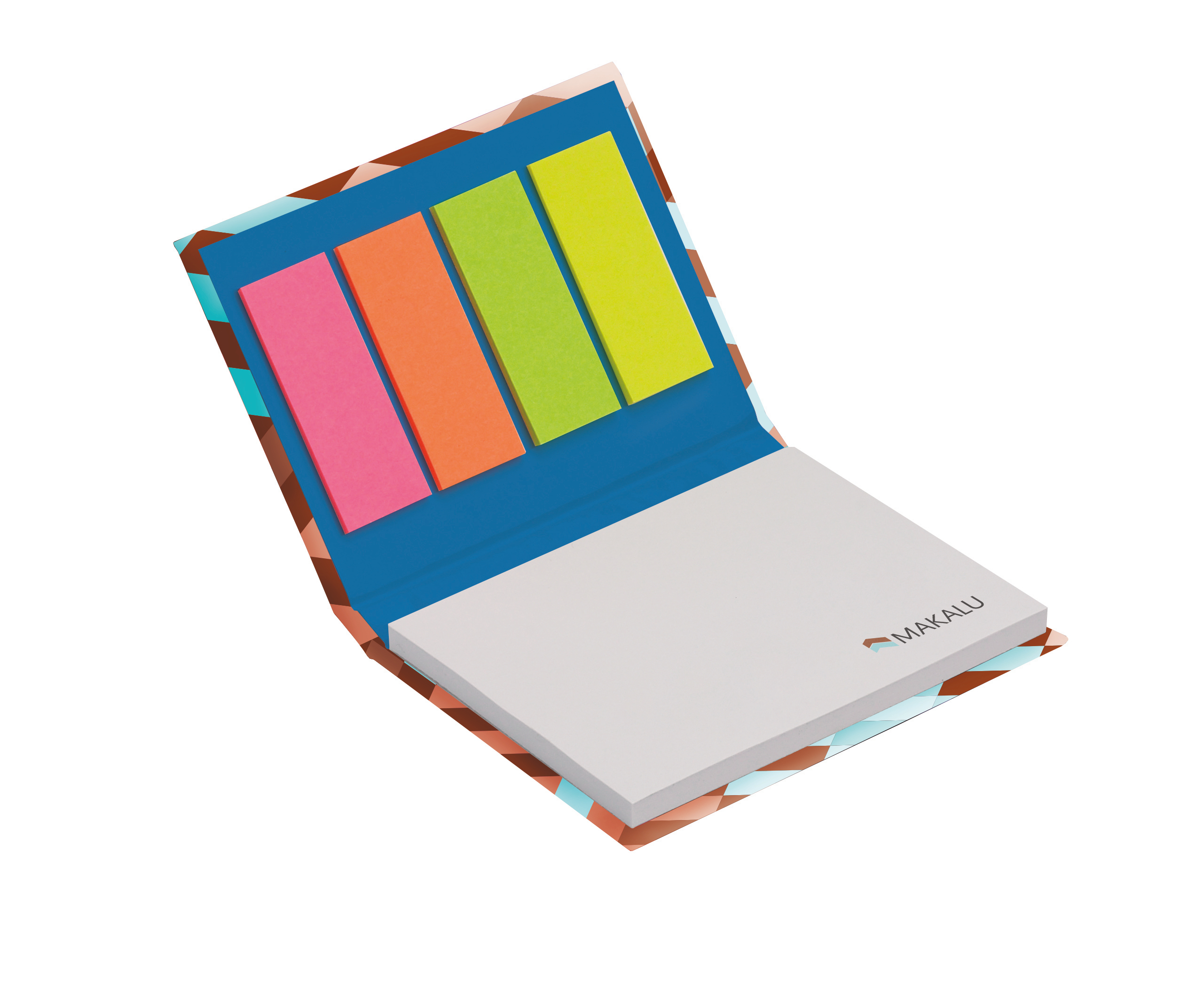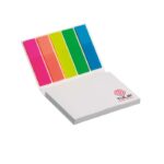 Διαφημιστικό Σημειωματάριο ορθογώνιο με σκληρό πλαστικοποιημένο εξώφυλλο και λευκά αυτοκόλλητα χαρτάκια σημειώσεων 80gsm με εκτύπωση σε αυτά ενός ή περισσότερων χρωμάτων του σχεδίου και των στοιχείων της επιχείρησής σας. Διαθέτει 50 φύλλα σημειώσεων (διαστάσεων 100mm x 72mm) και 15 σελιδοδείκτες 4 χρωμάτων.