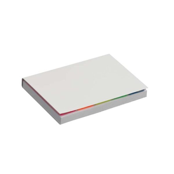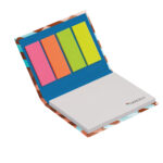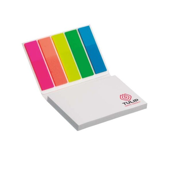 Διαφημιστικό Σημειωματάριο ορθογώνιο με μαλακό πλαστικοποιημένο εξώφυλλο και λευκά αυτοκόλλητα χαρτάκια σημειώσεων 80gsm με εκτύπωση σε αυτά ενός ή περισσότερων χρωμάτων του σχεδίου και των στοιχείων της επιχείρησής σας. Διαθέτει 50 φύλλα σημειώσεων (διαστάσεων 50mm x 72mm) και 20 σελιδοδείκτες 5 χρωμάτων.