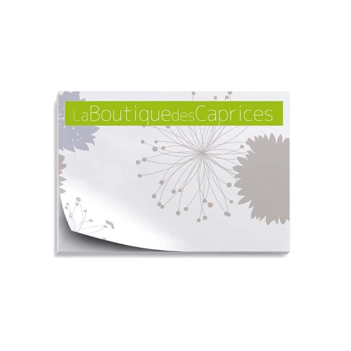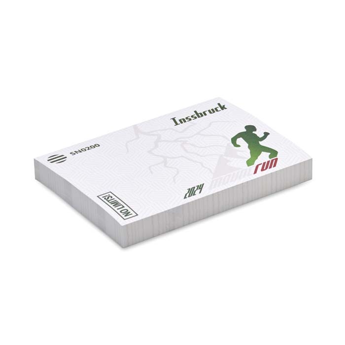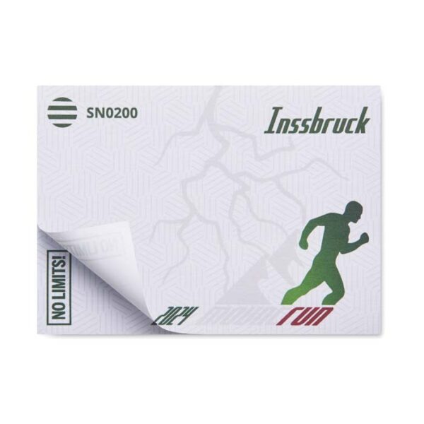 Διαφημιστικό Σημειωματάριο τετράγωνο με λευκά αυτοκόλλητα χαρτάκια σημειώσεων 80gsm και την εκτύπωση σε αυτά ενός ή περισσότερων χρωμάτων του σχεδίου και των στοιχείων της επιχείρησής σας. Διαθέτει δυνατότητα επιλογής ανάμεσα σε 25, 50 ή και 100 φύλλα σημειώσεων. Χαρτόνι κάτω εξωφύλλου 170gsm.