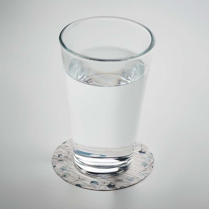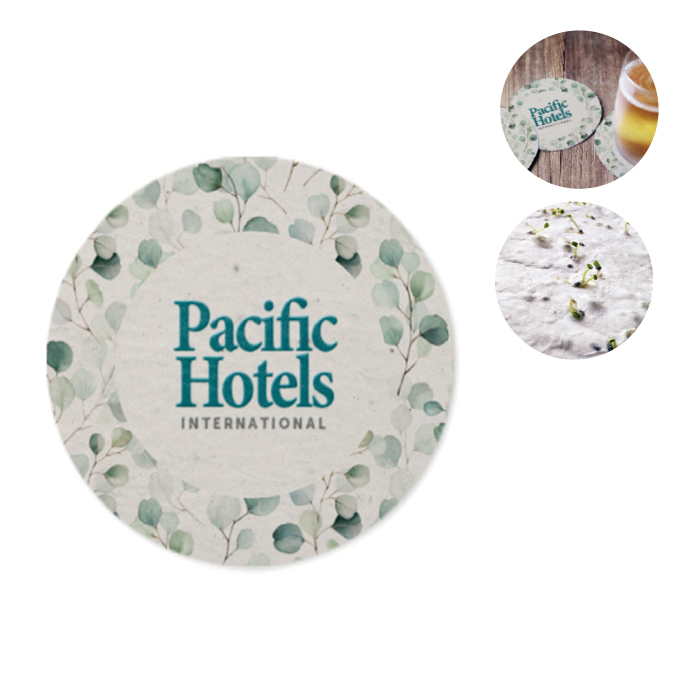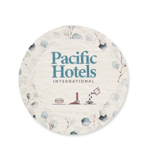 Διαφημιστικό Σουβέρ στρογγυλού σχήματος με χαρτί με σπόρους για φύτεμα 80gsm κατασκευασμένο από απορρίμματα χαρτιού μετά την κατανάλωση με εκτύπωση του σχεδίου και των στοιχείων της επιχείρησής σας. Μετά τη χρήση, απλώς φυτέψτε το σουβέρ στο χώμα και τα λουλούδια, τα βότανα ή τα λαχανικά της επιλογής σας θα φυτρώσουν.