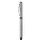 Διαφημιστικό Στυλό Πολυλειτουργικό με ασημί μεταλλικό σώμα και εκτύπωση ή χάραξη laser των στοιχείων της επιχείρησής σας. Περιλαμβάνει μπλε μελάνι, λευκό φωτάκι LED και κόκκινο φως-δείκτη laser (pointer). Λειτουργεί με 3 μπαταρίες κουμπί CELL.