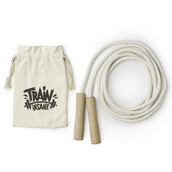 Διαφημιστικό Σχοινάκι Γυμναστικής με σχοινί από βαμβάκι και ξύλινες λαβές για άνετο κράτημα. Συσκευασία σε βαμβακερή θήκη-πουγκί με εκτύπωση ή εκτύπωση laser ή και ψηφιακή εκτύπωση των στοιχείων της επιχείρησής σας.