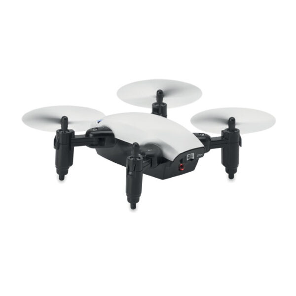 Διαφημιστικό Drone πτυσσόμενο και επαναφορτιζόμενο από πλαστικό ABS με εκτύπωση των στοιχείων της επιχείρησής σας. Διαθέτει λειτουργία WiFi που περιλαμβάνει κάμερα για λήψη φωτογραφιών και βίντεο και επαναφορτιζόμενη μπαταρία ιόντων λιθίου 300mAh. Συνοδεύεται από τηλεχειριστήριο, με το οποίο μπορείτε να ελέγχετε το drone με την κινητή σας συσκευή μέσω εφαρμογής. Λειτουργεί με 2 μπαταρίες AAA (δεν περιλαμβάνονται).