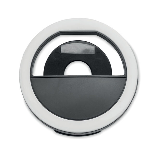 Διαφημιστικό Selfie Ring φορητό, κατασκευασμένο από πλαστικό ABS με εκτύπωση ή ψηφιακή εκτύπωση των στοιχείων της επιχείρησής σας. Διαθέτει 28 λυχνίες LED λευκού φωτός με 3 επίπεδα φωτεινότητας τοποθετημένα σε κύκλο για να έχετε ωραίο και ομοιόμορφο φωτισμό στο πρόσωπό σας κατά την λήψη του βίντεο ή των φωτογραφιών σας. Η λάμπα διαθέτει επαναφορτιζόμενη μπαταρία USB 80 mAh. Κλιπ για εύκολη τοποθέτηση στο smartphone σας.