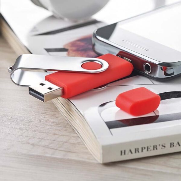 Διαφημιστικό USB Stick 2.0 & 3.0 με σώμα από πλαστικό ABS με θύρες microUSB και Type-Α και μεταλλικό περιστρεφόμενο κλιπ με εκτύπωση του σχεδίου και των στοιχείων της επιχείρησής σας. Διατίθεται στις παρακάτω  διαθέσιμες χωρητικότητες: 1GB, 2GB, 4GB, 8GB, 16GB, 32GB, 64GB.
