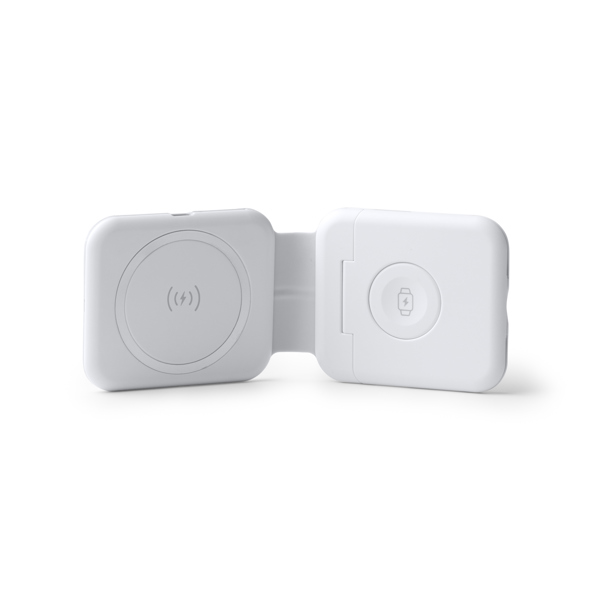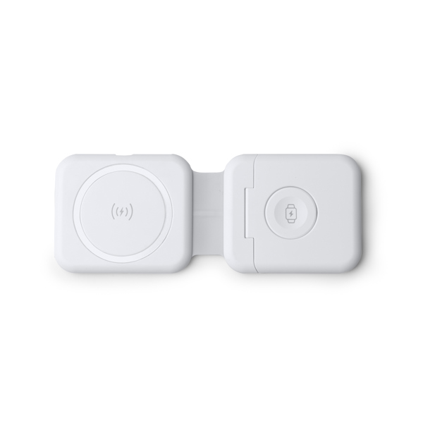 Διαφημιστική Βάση Ασύρματης Φόρτισης ισχύος 15W με αναδιπλούμενη λειτουργία, κατασκευασμένη από πλαστικό ABS με εκτύπωση ή ψηφιακή εκτύπωση των στοιχείων της επιχείρησής σας. Διαθέτει μια βάση για τη φόρτιση smartphone και ασύρματων ακουστικών και μία για φόρτιση smartwatch. Περιλαμβάνει καλώδιο Type-C και προσαρμογέα USB σε Type-C, καθώς και εγχειρίδιο οδηγιών σε 6 γλώσσες.