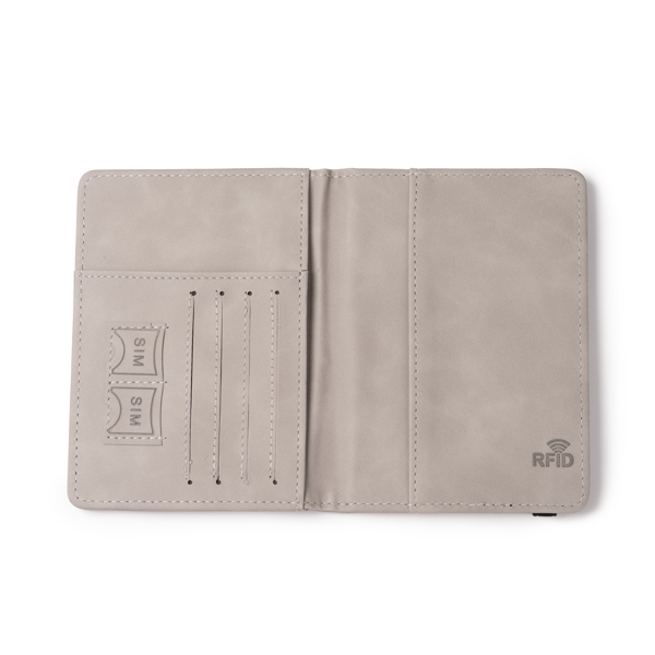 Διαφημιστική Θήκη Διαβατηρίου και καρτών από δερματίνη PU με εκτύπωση ή θερμομεταφορά των στοιχείων της επιχείρησής σας. Περιλαμβάνει μία θήκη για το διαβατήριο, 4 θήκες για κάρτες και 2 θήκες για κάρτες SIM. Ελαστικός ιμάντας κλεισίματος.