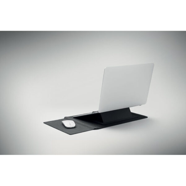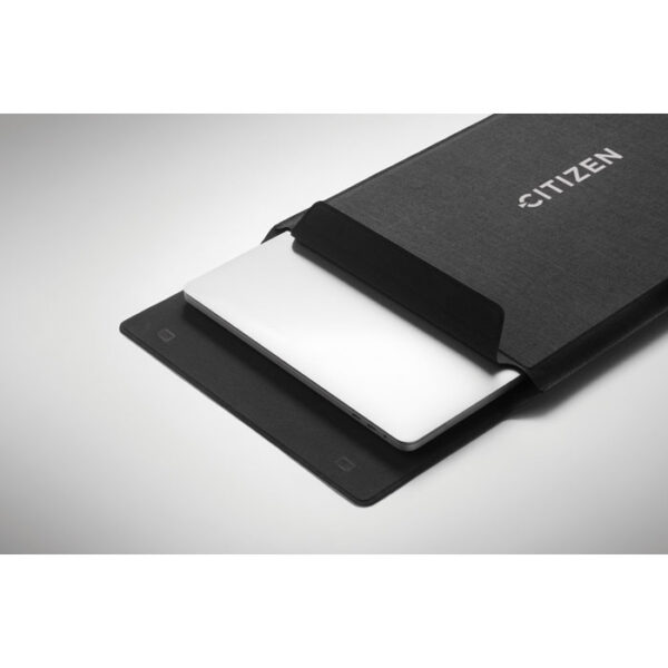 Διαφημιστική Θήκη Φορητού Υπολογιστή 16 ιντσών από πολυεστέρα PRET με μεταξοτυπία ή θερμομεταφορά ή και ψηφιακή θερμομεταφορά των στοιχείων της επιχείρησής σας. Εκτός από θήκη μεταφοράς λειτουργεί και ως mousepad, ενώ αν αναδιπλωθεί χρησιμεύει και ως βάση εναπόθεσης του υπολογιστή.