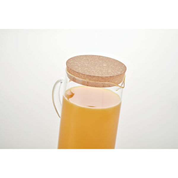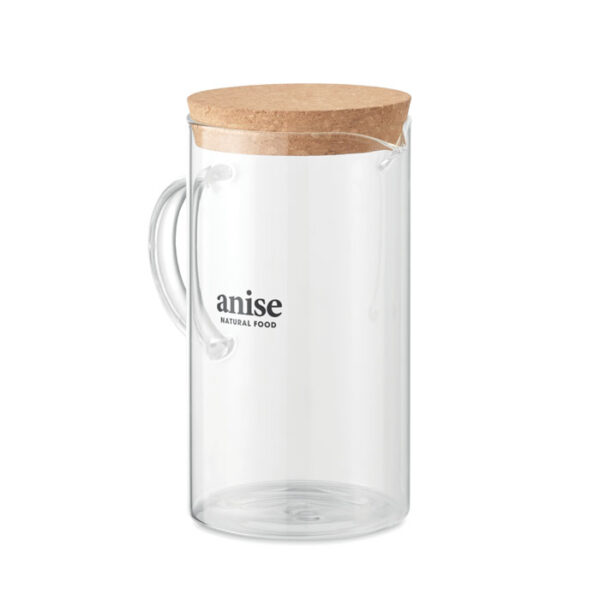 Διαφημιστική Κανάτα μονού τοιχώματος από βοριοπυριτικό γυαλί υψηλής ποιότητας και προστατευτικό πώμα από φελλό με εκτύπωση ή χάραξη laser των στοιχείων της επιχείρησής σας. Δυνατότητα σερβιρίσματος και ζεστών υγρών. Χωρητικότητα: 1L.