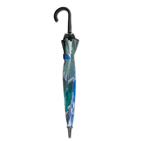 Διαφημιστική Ομπρέλα κατασκευασμένη από ενιαίο ύφασμα πολυεστέρα pongee, μεταλλικό σκελετό ινών υαλοβάμβακα και κυρτή πλαστική λαβή με λαστιχωτή υφή και εκτύπωση του σχεδίου και των στοιχείων της επιχείρησής σας. Αυτόματο άνοιγμα. Διάμετρος ανοίγματος: 23 ίντσες.