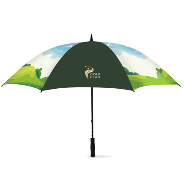 Διαφημιστική Ομπρέλα αντιανεμική, κατασκευασμένη από ίνες υαλοβάμβακα, με μεταλλικό σκελετό και λαβή από πλαστικό EVA με εκτύπωση του σχεδίου και των στοιχείων της επιχείρησής σας. Χειροκίνητο άνοιγμα. Διάμετρος ανοίγματος: 30 ίντσες.