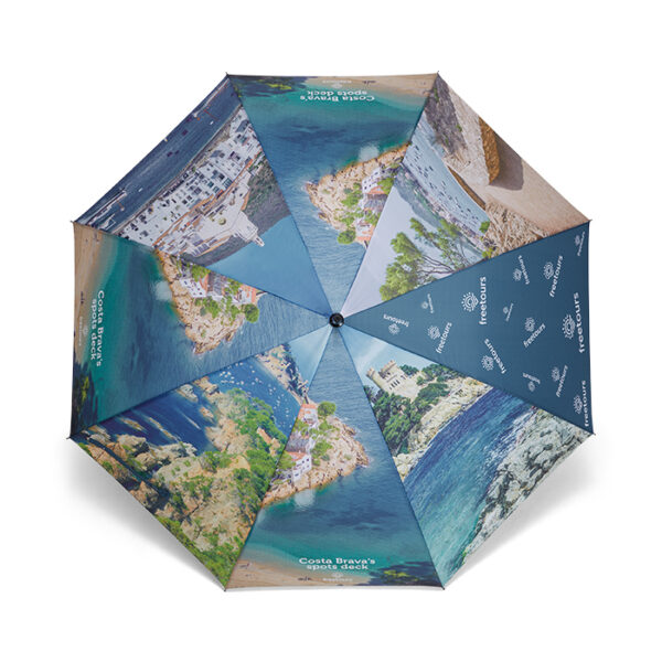 Διαφημιστική Ομπρέλα αντιανεμική κατασκευασμένη από ύφασμα πολυεστέρα με σκελετό από υαλοβάμβακα και ίσια πλαστική λαβή με εκτύπωση του σχεδίου και των στοιχείων της επιχείρησής σας. Αυτόματο άνοιγμα. Διάμετρος ανοίγματος: 27 ίντσες.
