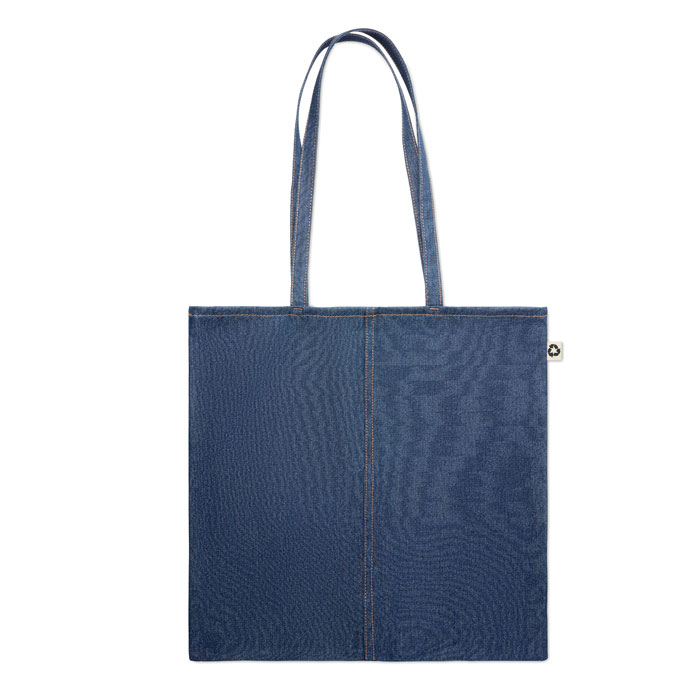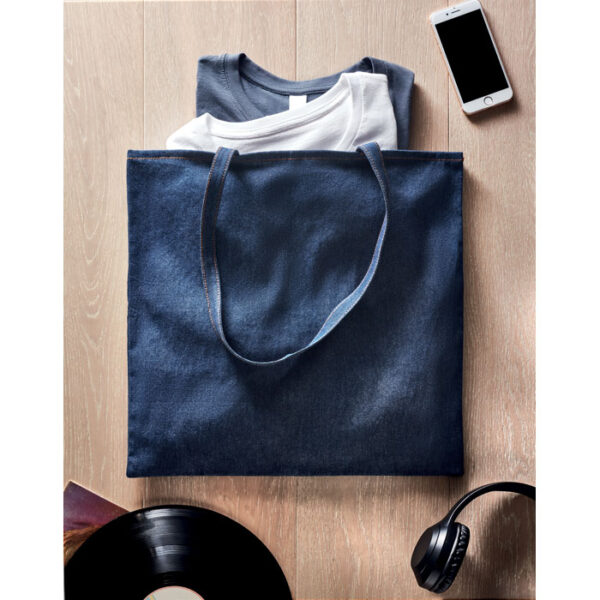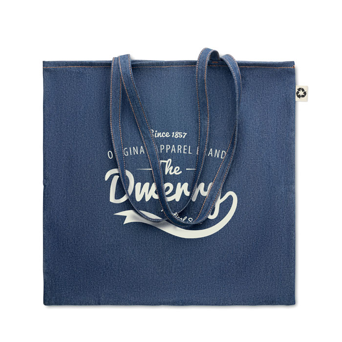 Διαφημιστική Tσάντα από 50% ανακυκλωμένο (βαμβακερό) ύφασμα τζην και 50% κανονικό βαμβάκι 250 gr/m² με εκτύπωση ή θερμομεταφορά ή και ψηφιακή θερμομεταφορά των στοιχείων της επιχείρησής σας. Λεπτές λαβές. Ιδανική για καθημερινή χρήση.