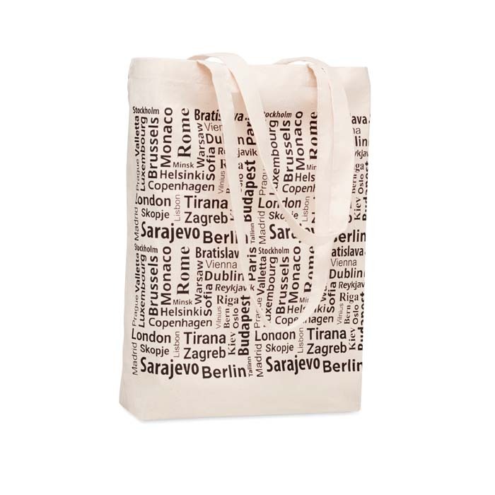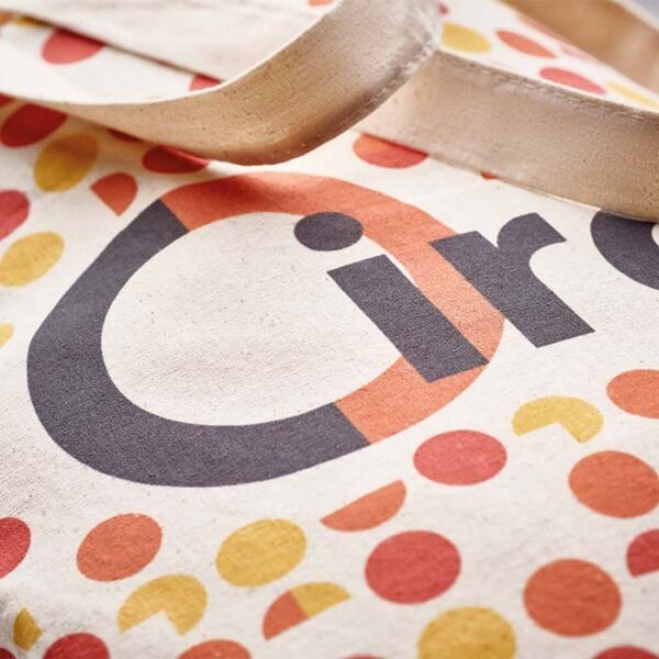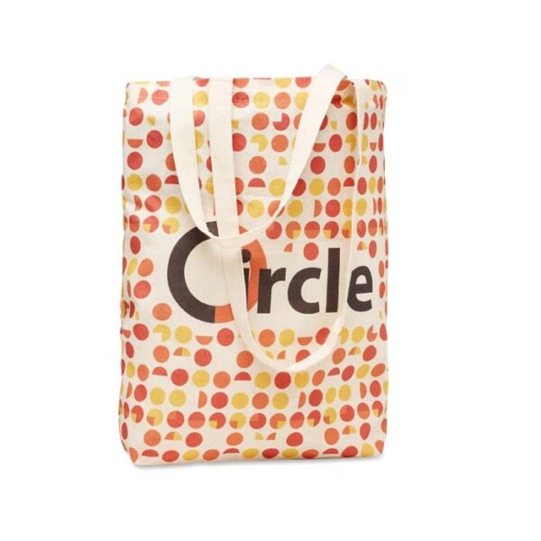 Διαφημιστική Τσάντα επαναχρησιμοποιούμενη από 100% ανακυκλωμένο βαμβάκι με μακριές λαβές και εκτύπωση του σχεδίου και των στοιχείων της επιχείρησής σας.